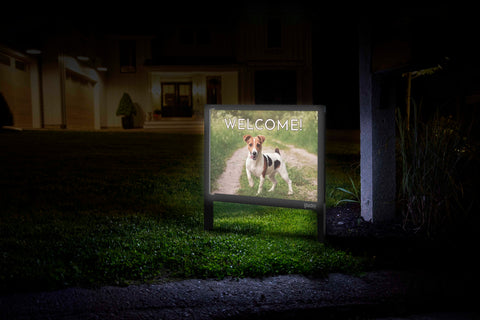 Your Yardsy Sign Starter Kit includes a durable, solar-powered frame (a one-time purchase) and two interchangeable inserts. - Refresh Anytime